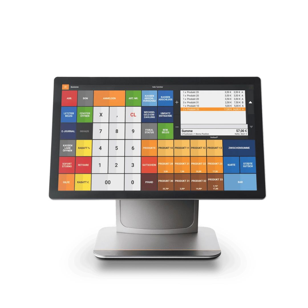 Das große 15,6″ Full-HD Multi-Touch-Display verarbeitet Eingaben präzise und blitzschnell. Selbst in Stoßzeiten läuft der Betrieb reibungslos und effizient. Änderungen an der Programmierung können direkt am Gerät vorgenommen werden – ohne externe Software. Neue Produkte oder Preisänderungen lassen sich sofort einpflegen und stehen unmittelbar zur Verfügung.